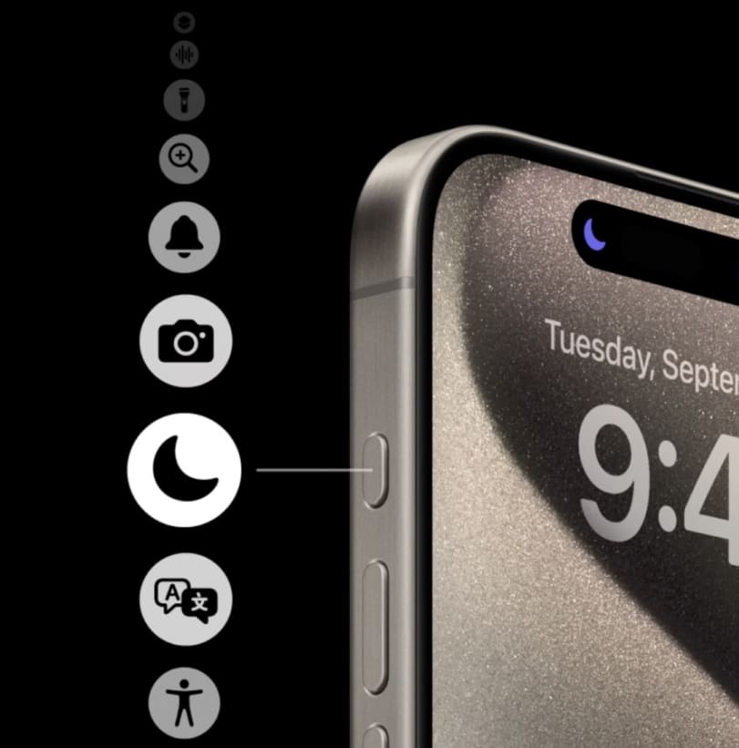 В iPhone 15 Pro Max больше нет переключателя беззвучного режима. Вместо него установлена кнопка, которая отвечает сразу за несколько действий: включение беззвучного режима, активация камеры, фонарика и других функций.
