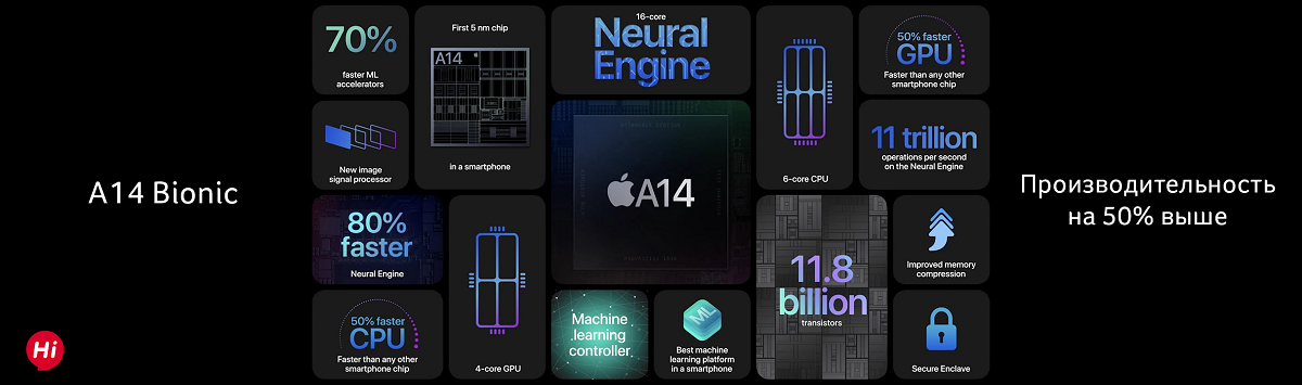 A14 Bionic имеет 11,8 миллиарда транзисторов. ЦП имеет 6 ядер, графическая система 4 ядра, а система машинного обучения Neural Engine тут 16 ядерная (вместо 8 ядер у A13).